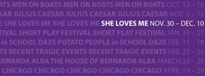 She Loves Me will be on stage in the Leary Theatre within the Elizabeth Ann Clune Center for Theatre, Clet Hall, at 7:00 pm on Thurs. Nov 30. and Thurs. Dec 7. The musical will be presented at 7:30 pm on Fri. Dec 1, Sat. Dec. 2 and Fri. Dec. 8. In addition, 2:00 pm matinees will be held on Sat. Dec 2, Sun. Dec 3 (with post-show discussion) and Sun. Dec. 10.