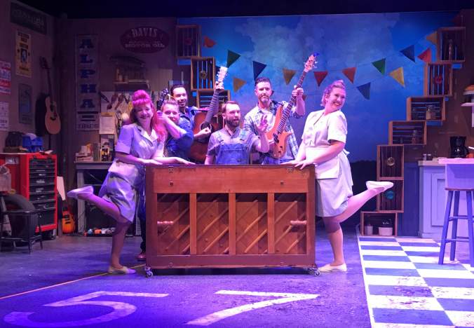 The obvious strength to the MusicalFare production of “Pump Boys & Dinettes” is the multi-instrumentalists that make up the ensemble. The group, specifically the “pump boys,” play almost every instrument at least once. As Jim, the “host” of the evening, Ryan Kaminski is the perfect country guy, with a guitar in hand and dream in heart. Kaminski is in his element, he’s a singer-songwriter himself, so he lets the music tell the story. He’s at his best when Jim sings a touching tribute to his grandmother, who has passed away. Kaminski gets in a rotation on bass and piano as well. Supporting Kaminski at the station are pump boys Eddie, L.M, and Jackson. As the quiet and reserved L.M, Joseph Donohue III is certainly enjoying himself. He makes the most of the character; an ad lib here, a take to one of the waitresses there. As previously mentioned, there’s not much by way of libretto in this show. It succeeds when the characters are having fun telling stories and playing songs. Donohue is having fun doing both. He plays the heck out of the piano, and manages to work a guitar, accordion, and fiddle into his rotation as well. Andrew J. Reimers and Jayson Clark, both members of Local 92 AFM (musician’s union) are terrific in their supporting roles and are accomplished players of pretty much every instrument you can think of to support the evening’s country, blues, and rockabilly styles. Clark is especially engaging while playing slide guitar.