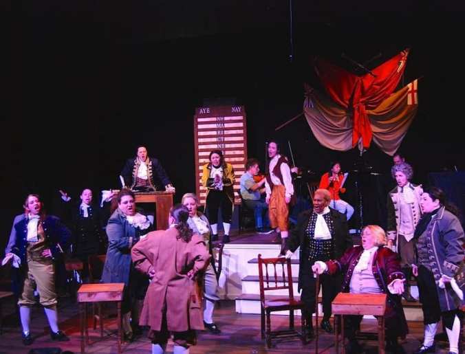 “1776,” the 1969 musical by Sherman Edwards and by Peter Stone, is a large ensemble show featuring all of the founding fathers you’ve heard of–and likely some that you haven’t–as they toil over many months to craft a Declaration of Independence that appeases the varied priorities and interests of delegates from all across the 13 colonies; particularly, whether or not to continue the practice of slavery. The show is largely seen through the eyes of John Adams (Pamela Rose Mangus) as he struggles to persuade his colleagues to vote for independence.