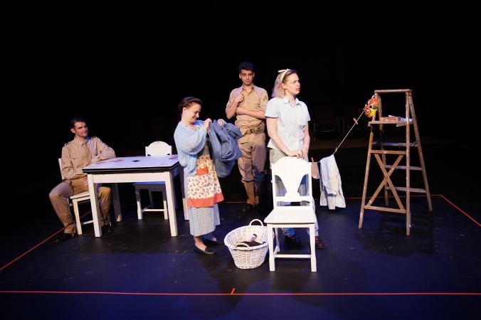As Diane (the character), Brittany Bassett has the difficult task of driving the play’s non-linear story without words. Quickly establishing herself as one of Buffalo’s premier young actresses, Bassett is up to the task. She has the expressiveness that silent movie actors would kill for, and she’s equal parts engaging and enthralling. The fluid nature of the storytelling makes it imperative to have a strong narrative thru-line, and Bassett puts on that responsibility with ease. As June, Diane’s grandmother, Anne Roaldi Boucher is stretched to the emotional limit. Boucher, too, has no trouble with the non-linear storytelling. Where a lesser actress may have “played up” the fantasy, Boucher takes the given moment for exactly what it is, often snapping in an out of the fantasy with ease. She’s particularly effective in the scene where she receives the dreaded telegram. As Harry, June’s husband, Zachary Bellus captures the young lover, the bitter younger sibling, and the matured soldier all in one fell swoop. Playing his older brother Francis, Nick Stevens makes an imposing soldier and terrific role model. The two have a camaraderie and chemistry that reminds me of my younger brother, and it must be surreal for Jones’ family to watch these two embody the real-life characters. [I read on the website for the production that a member of Jones’ family was impressed with how well Boucher was able to capture the real life June]