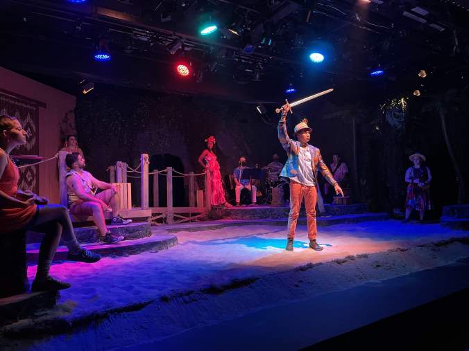 Co-directors Carlos R.A. Jones and Victoria Perez set the show in a tropical setting, with a group of beachy-clad friends hanging out and putting on a show. Outside of Ex Calibur, swords became wood poles and shields are pieces of found driftwood. King Arthur’s crown was a fedora with a bird of paradise rising from the hat band. The call to battle was sounded from a seashell. Music director Theresa Quinn matched the mood with Latin and island rhythms for every tune. Chris Cavanagh’s set was sandy-perfection, complete with a waterfall and a boardwalk. Camp shirts, neon rompers, and floral prints replaced armor and flowing chiffon gowns. The whole effect was oddly reminiscent of early stagings of Godspell (without the clown clothes and street setting). It was fun and inviting after our 18 month intermission.